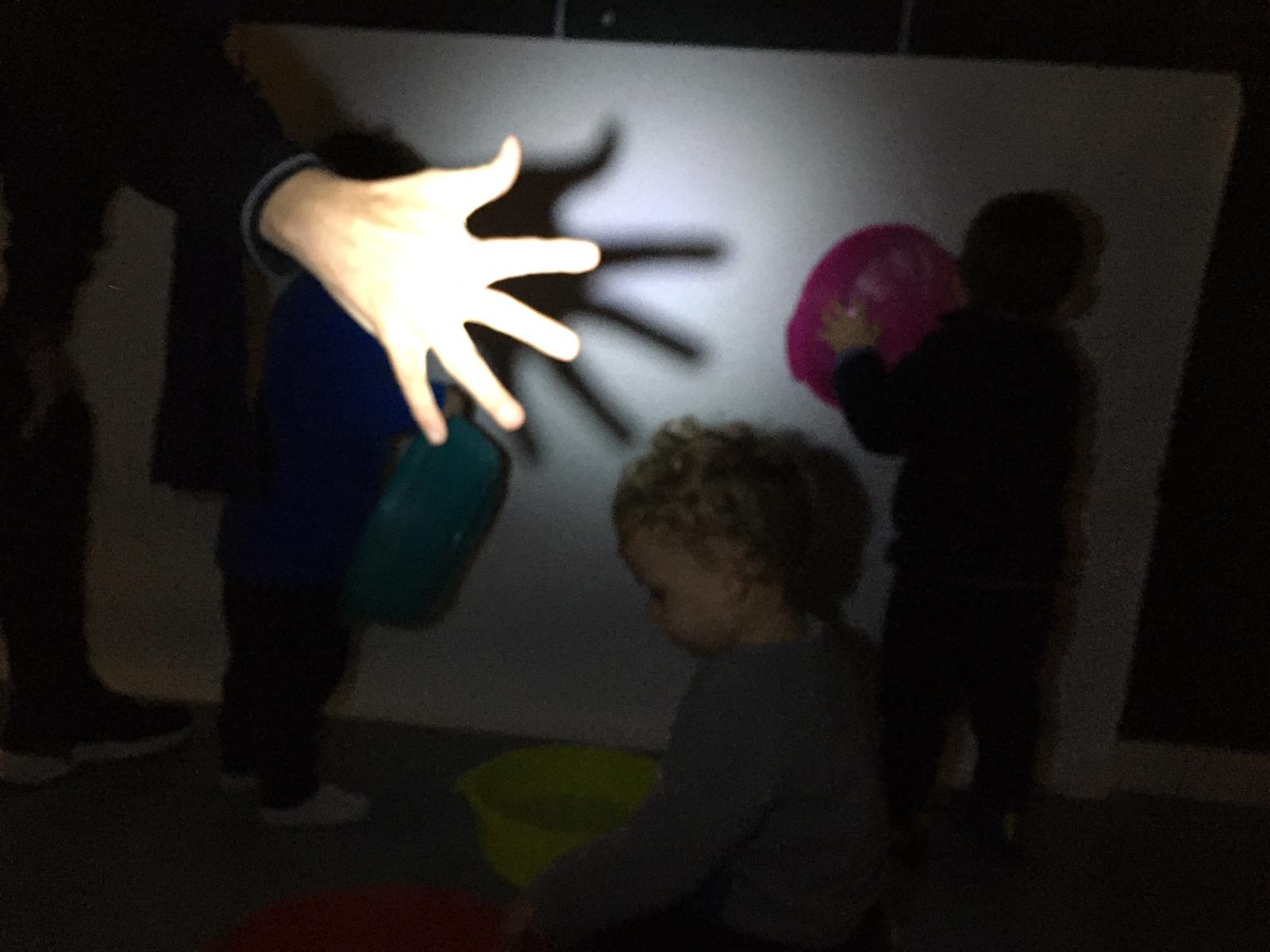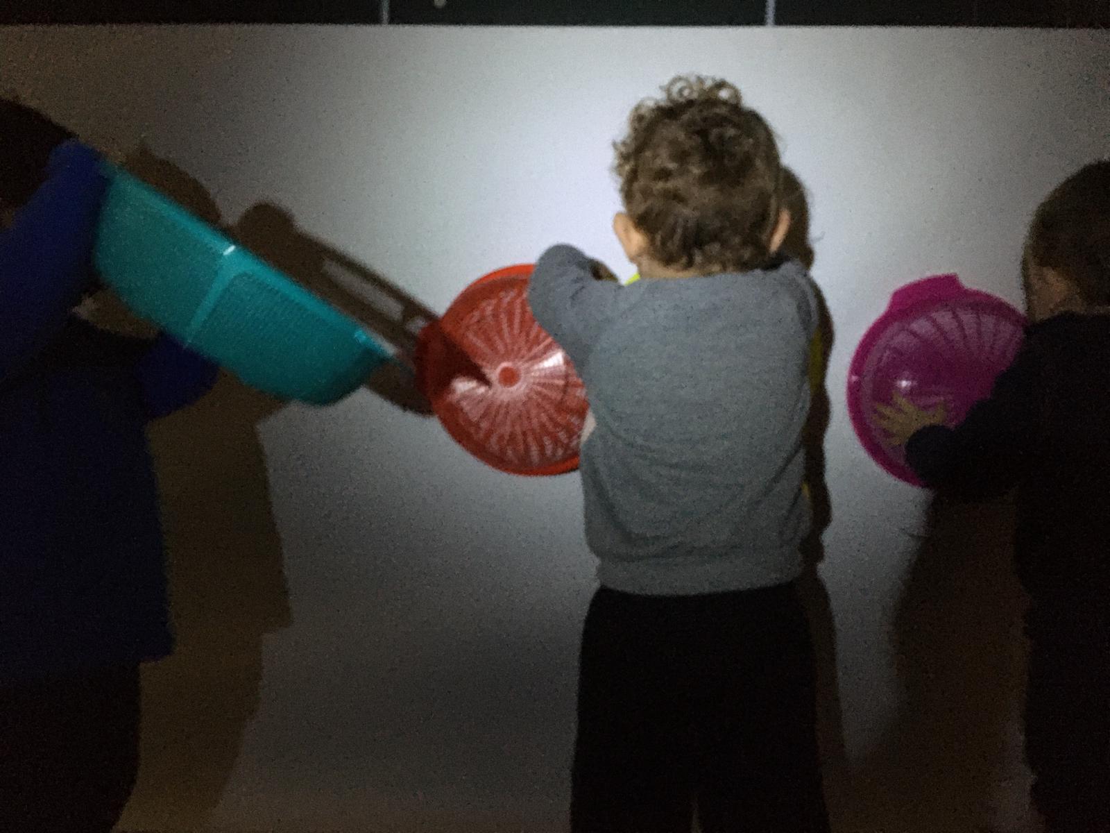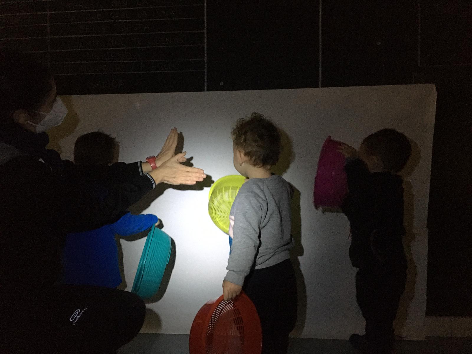 Catalina trajo una gran variedad de objetos y materiales para poder jugar y experimentar con ellos (linternas, folios de diferentes colores y tamaños, pañuelos, etc).